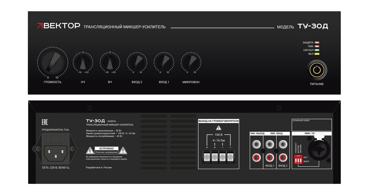 Микшер-усилитель комбинированный. ВЕКТОР ТУ-30Д Микшер-усилитель класс D. 30 Вт. Потребляемая мощность 45 Вт. Выход 100В/4-16Ом, 1 микр и 2 AUX входа, 1 AUX выход. 220В, 330х88х225 мм, 3,8 кг. Рэковое крепление в комплекте.