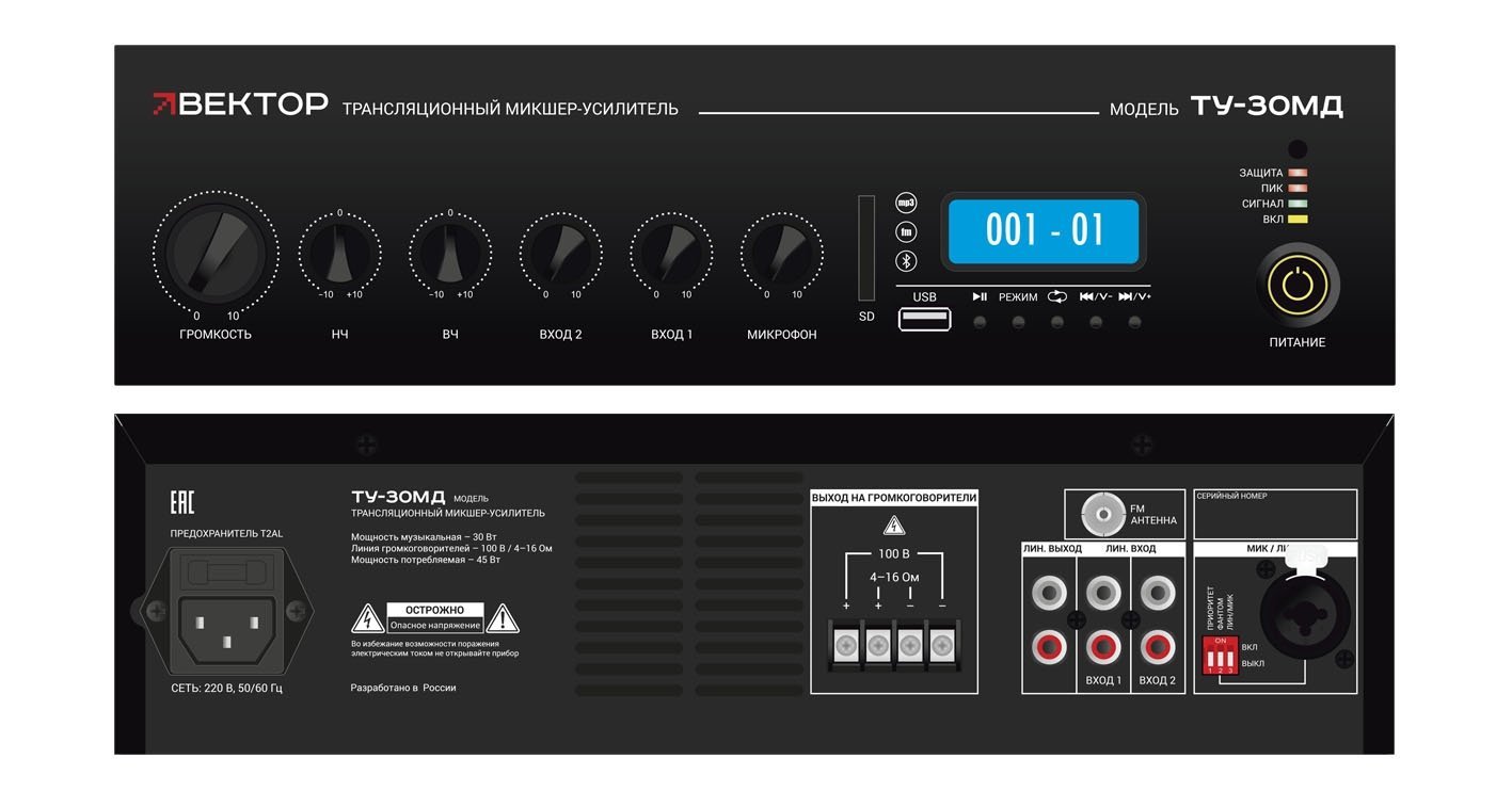 Микшер-усилитель комбинированный. ВЕКТОР ТУ-30МД Комбинированный микшер-усилитель класс D. Мощность 30 Вт. Потребляемая мощность 45 Вт. Выход 100 В/4-16Ом, 1 микр и 2 AUX входа, 1 AUX выход. Цифровой FM тюнер, MP3 плеер, USB, SD, Bluetooth. 220В, 330х88х250 мм, 3,9 кг. Рэковое крепление в комплекте.