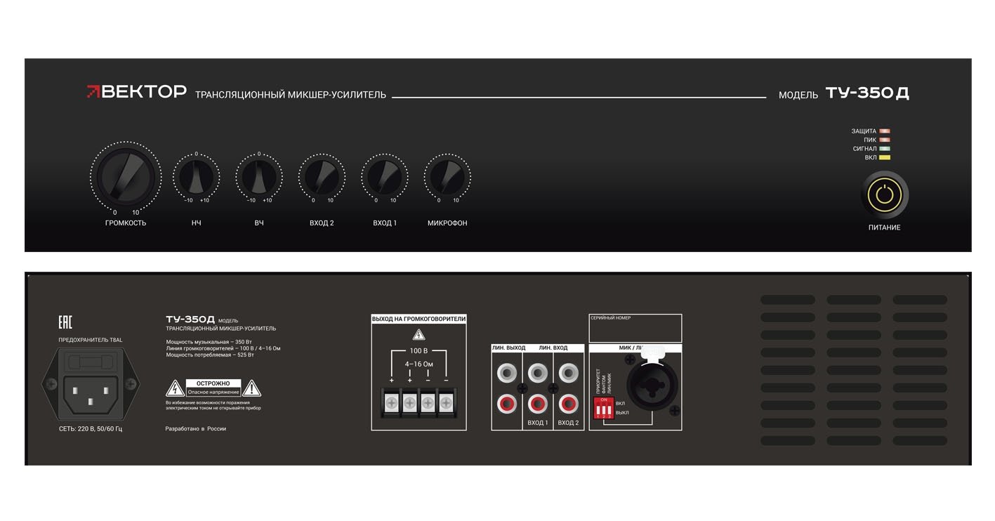 Микшер-усилитель комбинированный. ВЕКТОР ТУ-350Д Микшер-усилитель класс D. 350 Вт. Потребляемая мощность 525 Вт. Выход 100В/4-16Ом, 1 микр и 2 AUX входа, 1 AUX выход. 220В, 430х88х375 мм, 8,8 кг. Рэковое крепление в комплекте.