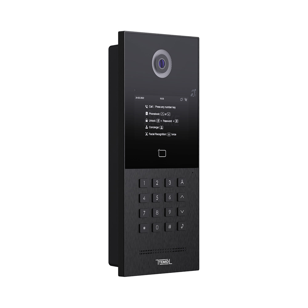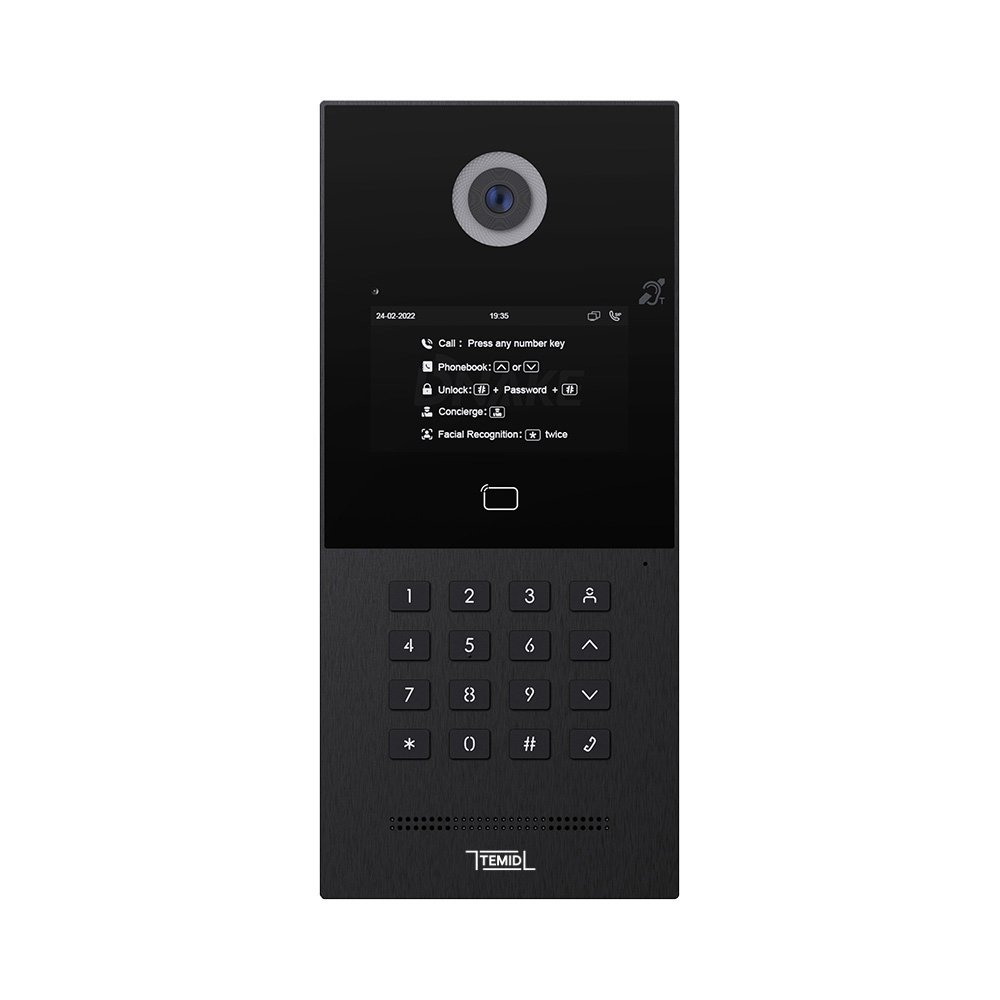 Вызывная панель IP-домофона. Вызывная IP видеопанель многоабонентская. Система: Linux. 4,3“ TFT цветной экран с подсветкой и подогревом. Цифровая IP камера: 2.0 Мп HD с ИК подсветкой.. Угол обзора 120° (по горизонтали). Считыватель MIFARE. Встроенное реле 3. Память: 20 000 лиц, 60 000 карт. IP65, -40...+55°C. Врезной монтаж. Питание: PoE (IEEE802.3af), DC 12V/2A. Поддержка SIP Ver 2.0. Алюминий. Закаленное стекло. Механические кнопки с подсветкой. 295х133х43 мм. Открытый API, поддержка Цвет - черный