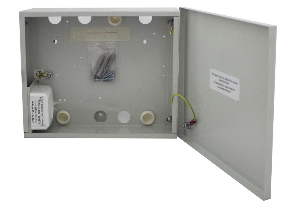 Бокс для монтажа блоков питания, управления и коммутации. Монтажный бокс для установки в нем БПД, БУД, БКМ, VIZIT-TU, БК, РВС, БП. Сетевая розетка. Защитное заземление. Вентиляция. 251х208х93 мм. Настенное крепление.