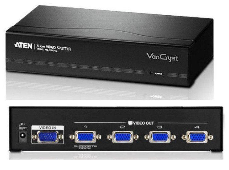 VS134A-A7-G – Видео Разветвитель ATEN VS134A дублирует видеосигнал от одного источника на 4 устройства отображения (мониторы, проекторы).Одновременно VS134A усиливает сигнал, что увеличивает дальность передачи на расстояние до 65 м. Трехуровневое каскадирование видеоразветвителей обеспечивает возможность трансляции изображения с одного источника на 64 устройства отображения.Разветвитель VS134A – лучший выбор для передачи нескольких сигналов VGA, XGA, SVGA, UXGA, QXGA или Multisync высокого качества на большие расстояния.Может применяться в таких областях как:• Финансы – удаленное отображение информации о рынке ценных бумаг• Образование – удаленное отображение лекций и уроков в аудиториях и классах• Бизнес – удаленное отображение в переполненных помещениях; видеоконференции; демонстрацииХарактеристики ATEN VS134A:- Один видео вход – на 4 видео выхода- Диапазон частот - до 450 МГц- Возможно создание каскадов до 3 уровней – подключение до 64 видеосигналов- Передача на большое расстояние – до 30 м *- Высочайшее качество видеоизображения – до 2048 x 1536- Поддержка мониторов VGA, XGA, SVGA, UXGA, QXGA и Multisync.- Встроенный усилитель на 1,5 ГГц позволяет видеосистеме поддерживать высочайшее качество- Цельнометаллический корпус