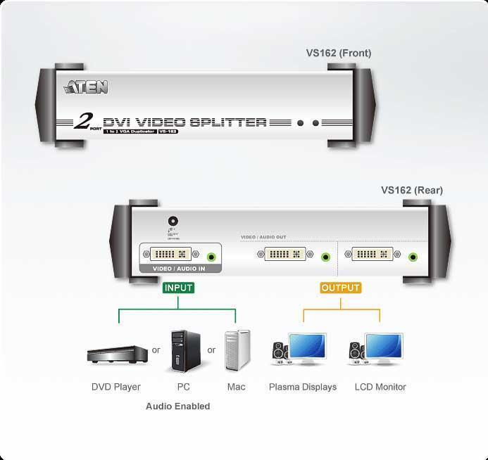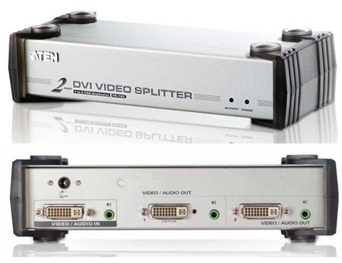S162-AT-G – Видео разветвитель ATEN VS162 усиливает и дублирует входные сигналы DVI-видео и аудио на 2 выхода DVI-видео и аудио.Разветвитель VS162 идеально подходит для любого широковещания, аудиторий, пользователей компьютеров, нуждающихся в дополнительных ресурсах.Характеристики ATEN VS162:- подключает компьютеры с DVI-графикой к нескольких DVI-совместимым мониторам или проекторам.- полностью совместим со спецификациями DVI-Digital и DVI-Analog.- поддерживает стандарт DDWG (рабочая группа с цифровыми дисплеями) для DVI-совместимых мониторов.- поддержка DDC/CI - через графический пользовательский интерфейс можно регулировать цвет, яркость, контрастность и другие параметры ЖК-мониторов, поддерживающих команды DDC/CI- возможно подключение громкоговорителя для прослушивания аудио.- возможно создание каскадов до 3 уровней – подключение до 8 видеосигналов.- расстояние каскадирования: От источника к устройству – 1,8 м, от устройства к устройству – 5 м, от устройства к дисплею – 5 м.- устанавливается за считанные минуты.- поддерживает наивысшее разрешение видео в режиме Single Link (до 1920 х 1200).- совместим с DDC, DDC2, DDC2B (только порт 1).- совместим с HDCP.- поддержка ОС: Windows 2000, Windows XP, Linux, Mac и Sun