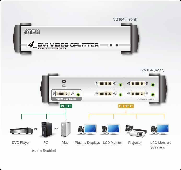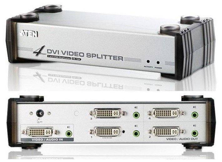 VS164-AT-G – Видео Разветвитель ATEN VS164 усиливает и дублирует входные сигналы DVI-видео и аудио на 4 выхода DVI-видео и аудио.Разветвитель VS164 идеально подходит для любого широковещания, аудиторий, пользователей компьютеров, нуждающихся в дополнительных ресурсах.Характеристики ATEN VS164:- подключает компьютеры с DVI-графикой к нескольких DVI-совместимым мониторам или проекторам.- полностью совместим со спецификациями DVI-Digital и DVI-Analog.- поддерживает стандарт DDWG (рабочая группа с цифровыми дисплеями) для DVI-совместимых мониторов.- поддержка DDC/CI - через графический пользовательский интерфейс можно регулировать цвет, яркость, контрастность и другие параметры ЖК-мониторов, поддерживающих команды DDC/CI- возможно подключение громкоговорителя для прослушивания аудио.- возможно создание каскадов до 3 уровней – подключение до 64 видеосигналов.- расстояние каскадирования: От источника к устройству – 1,8 м, от устройства к устройству – 5 м, от устройства к дисплею – 5 м.- устанавливается за считанные минуты.- поддерживает наивысшее разрешение видео в режиме Single Link (до 1920 х 1200).- совместим с DDC, DDC2, DDC2B (только порт 1).- совместим с HDCP.- поддержка ОС: Windows 2000, Windows XP, Linux, Mac и Sun
