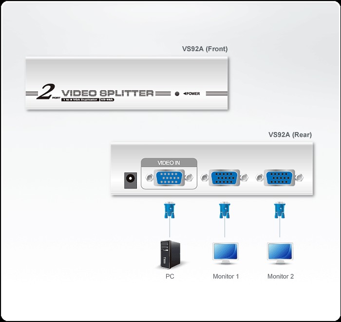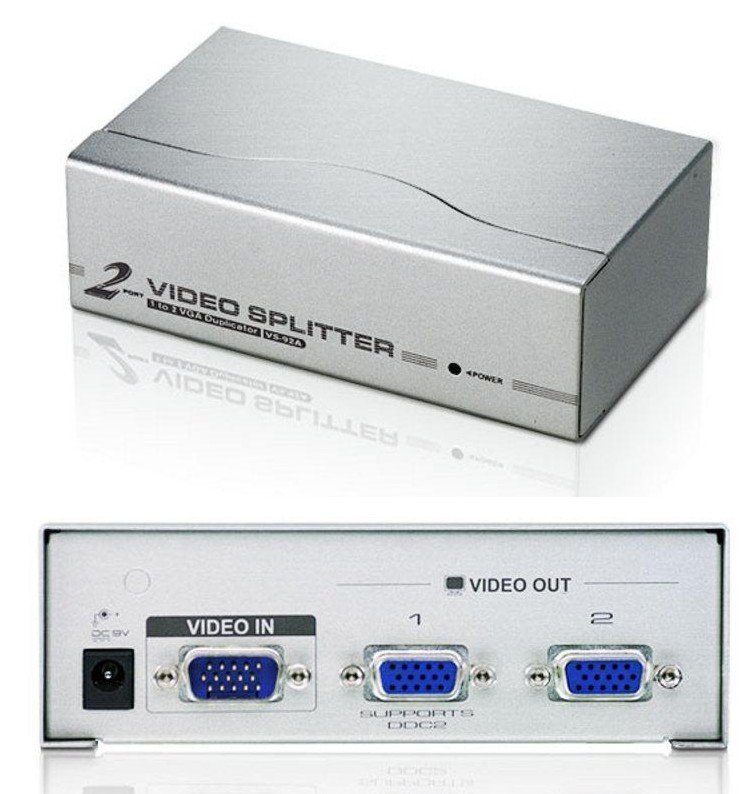 VS92A-A7-G – Видео Разветвитель ATEN VS92A дублирует видеосигнал с любого монитора VGA, XGA, SVGA, UXGA или Multisync на два выхода.Разветвитель VS92A благодаря возможности каскадирования с поддержкой до 8 дисплеев и частотному диапазону до 350 МГц идеально подходит для трансляции видеоинформации широкой аудитории, слежения за рабочей обстановкой из безопасного места, обеспечения высококачественного видео для бизнеса и обучения в аудиториях.Характеристики ATEN VS92A:- один видеовход – на 2 видеовыхода.- возможно создание каскадов до 3 уровней – подключение до 8 видеосигналов.- частотный диапазон – до 350 МГц.- передача на большое расстояние – до 30 м. *- замечательное качество видео - 1920 x 1440, 60 гц.- совместим с DDC, DDC2, DDC2B (только порт 1).- поддерживает мониторы VGA, XGA, SVGA, UXGA, WUXGA и Multisync.- цельнометаллический корпус.* Передача видео контента на значительные расстояния с помощью VGA кабеля может привести к незначительному ухудшению качества сигнала.