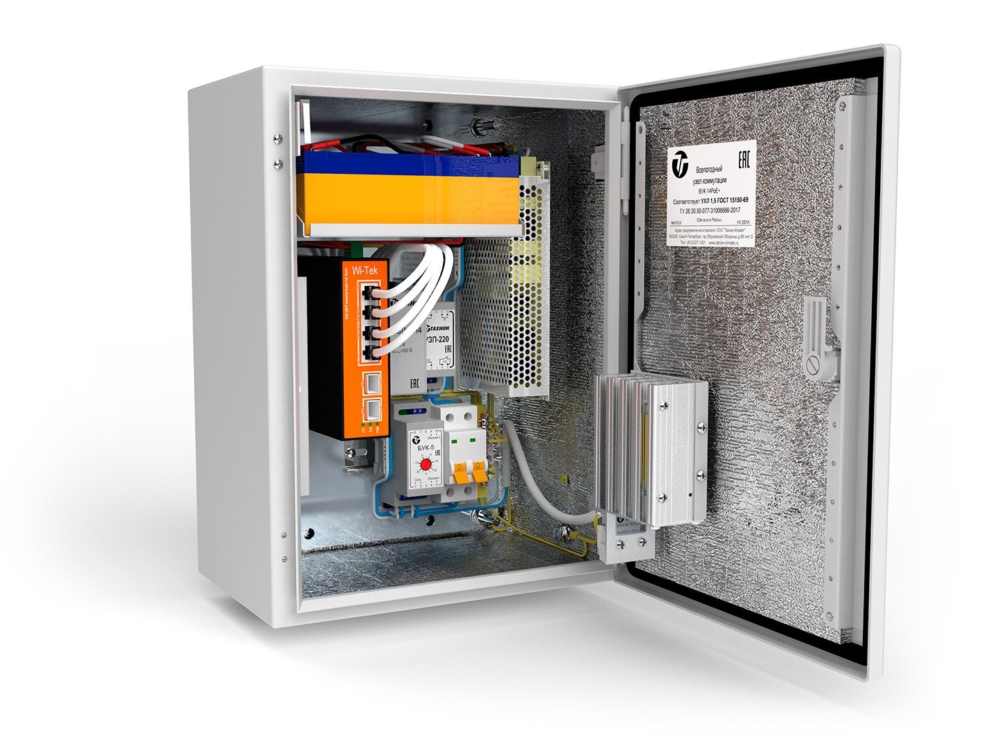 Уличная станция. Всепогодный узел коммутации: управляемый гигабитный коммутатор, 4xRJ45 порта POE 10/100/1000Мб(af/at/bt); 2хSFP порта 1G; 1 порт Console; POE бюджет 140Вт; блок управления климатом БУК-5; обогреватель ОТШ-40; ИБП 48В/155Вт, кронштейн для аккум. 2.2аЧ; устройством защиты электропитания УЗП-220; блоком защиты от импульсных перенапряжений БЗЛ-ЕП4; оптический кросс SC; тамперный контакт; Автомат ВА47-292Р 6А; корпус из стали; IP66; -60…+50°С; AC 220В; 200Вт; гермовводы; 300х300х210 мм.