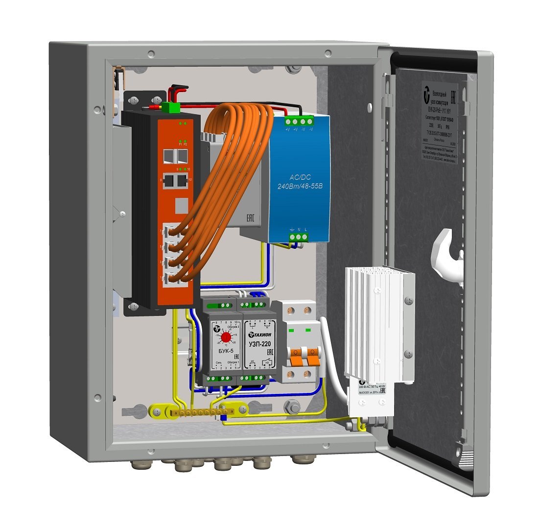 Уличная станция. Всепогодный узел коммутации: управляемый гигабитный коммутатор, 8xRJ45 порта POE 10/100/1000Мб(af/at/bt); 2хSFP порта 1G; POE бюджет 230Вт; Watchdog; блок управления климатом БУК-5; обогреватель ОТШ-40; БП 48В/240Вт, устройством защиты электропитания УЗП-220; блоком защиты от импульсных перенапряжений БЗЛ-ЕП4; оптический кросс SC; тамперный контакт; Автомат ВА47-292Р 6А; корпус из стали; IP66; -60…+50°С; AC 220В; 290Вт; гермовводы; 300х300х210 мм.